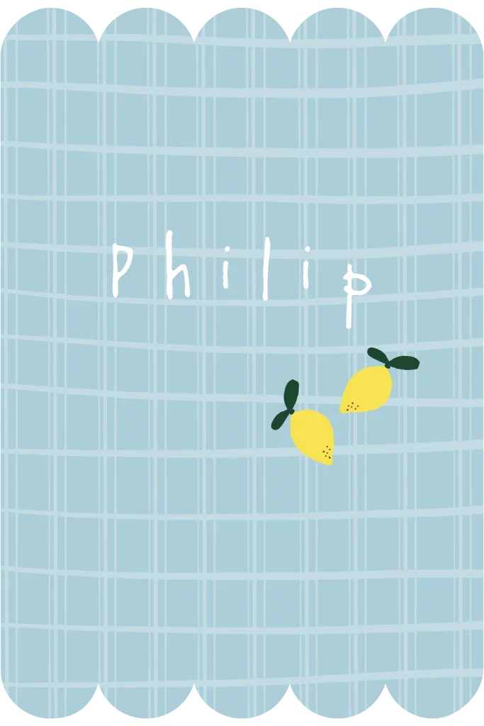 Geboortekaartje voor een jongen met kartelrand en ruitjes patroon. Met speelse, gele citroenen.