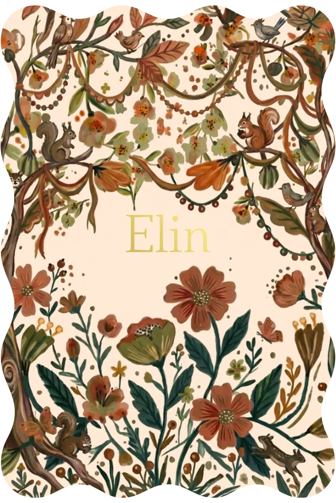 Geboortekaartje voor een meisje met een illustratie vol bloemen, bomen, slingers en eekhoorntjes en vogeltjes.