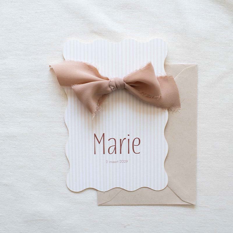 Geboortekaartje voor een meisje. Met een klassieke look door de gestreepte achtergrond en oudroze zijden strik. Dit lint bestel je er los bij in het bestelproces.