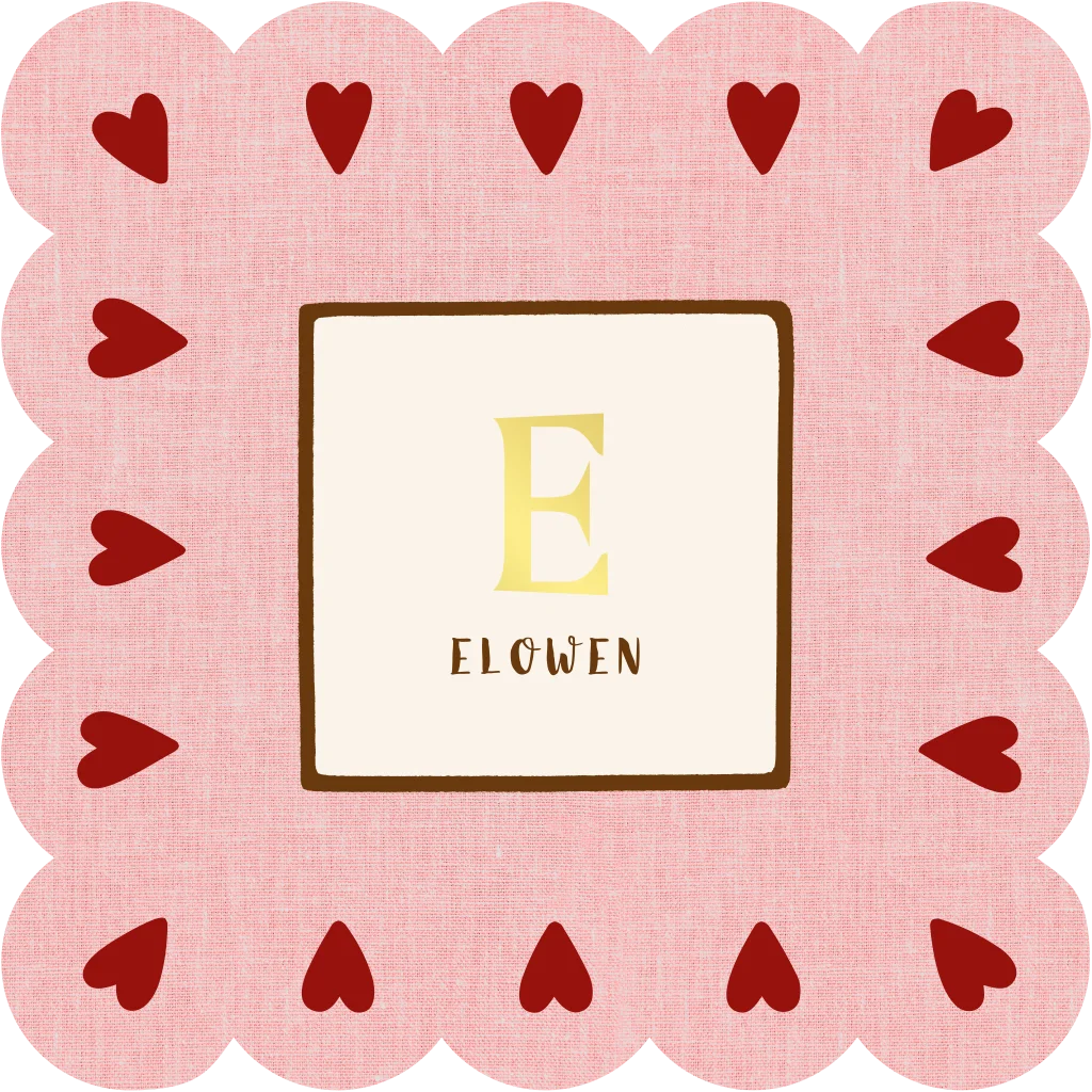 Origineel geboortekaartje voor meisjes met een roze linnen look en vrolijke rode hartjes. De voorletter op de voorzijde staat in goudfolie.