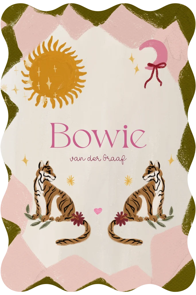 Geboortekaartje in boho eclectische stijl. Met gebruik van verschillende kleuren, vormen, zon, maan, sterren en 2 sierlijke tijgers.