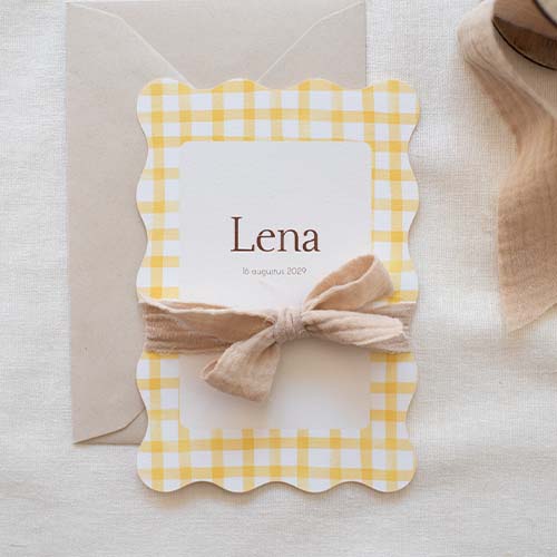Zomers geboortekaartje voor een meisje met geel ruitjes patroon en de mogelijkheid om een strik van lint onder de naam vast te maken.