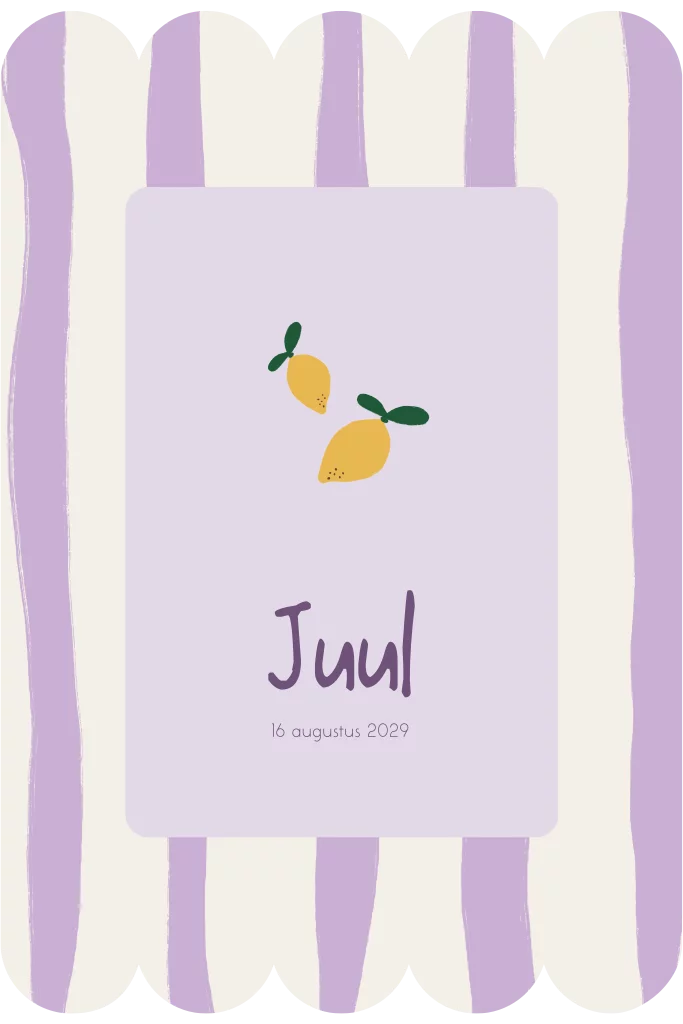 Zomers geboortekaartje voor een meisje met kartelrand speelse strepen in lila, paarse en beige tinten. Op de kaart staan vrolijke citroenen. Een kleurrijk kaartje voor de echte zomer baby's!