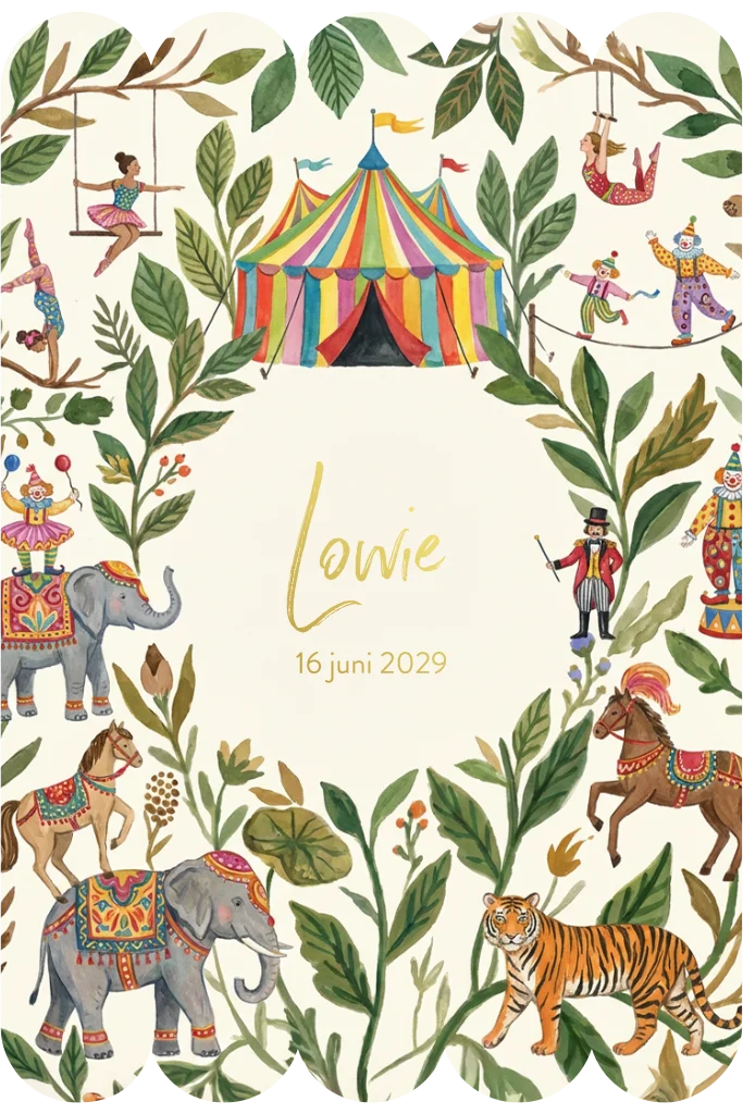 Geboortekaartje voor zowel een jongen als meisje. Met een sprookjesachtige illustratie van het circus. De kaart heeft een originele vorm en goudfolie tekst op de voorzijde.