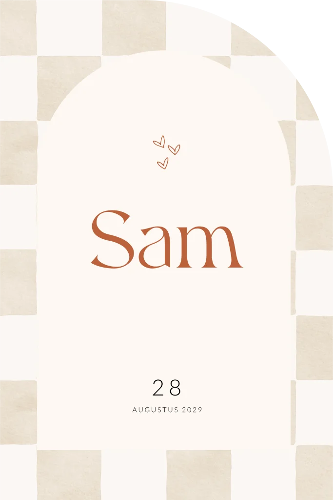 Geblokt, unisex geboortekaartje in neutrale tinten zand en terracotta. De kaart heeft een originele vorm voor een extra unieke look!