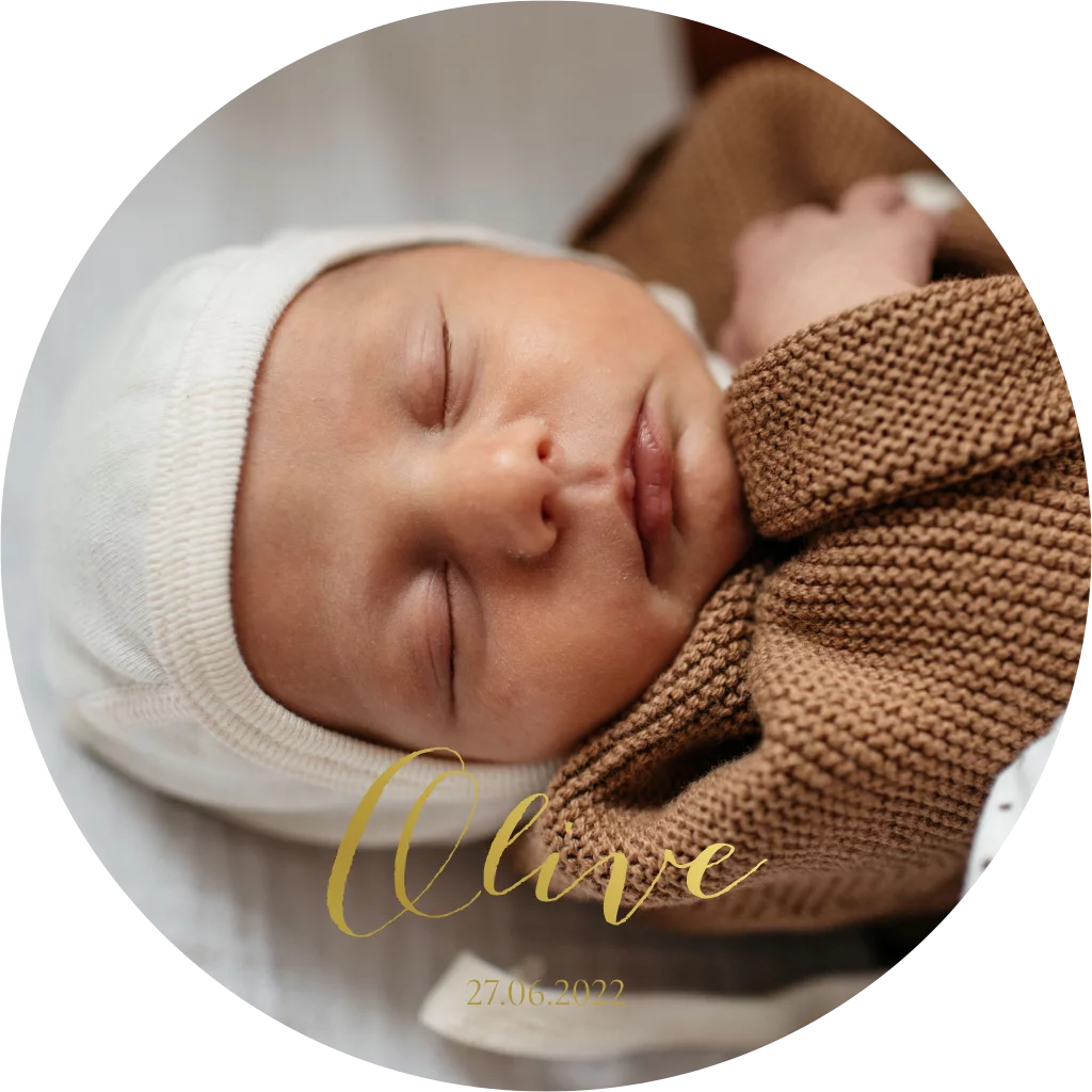 Een rond geboortekaartje met een foto en goudfolie opdruk aan de voorzijde.
