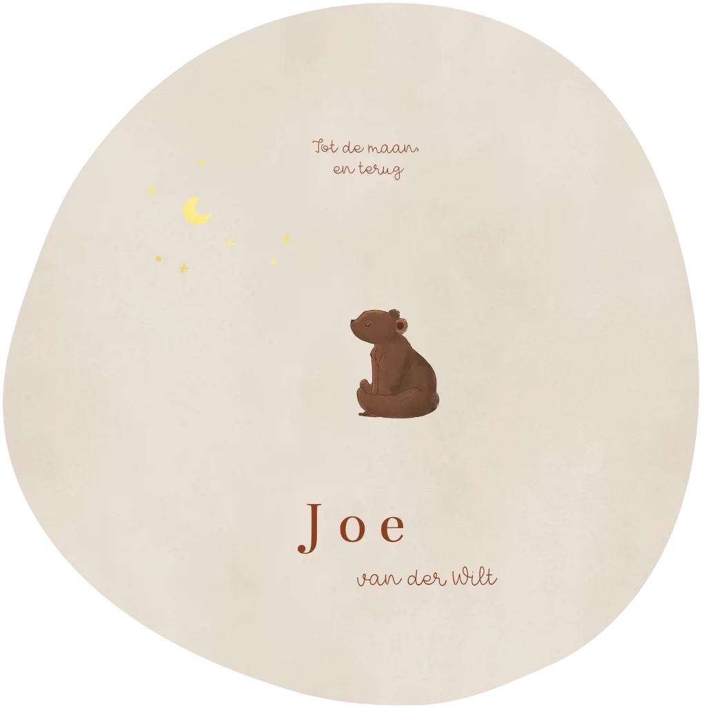 Een uniek geboortekaartje met een bijzondere ronde vorm. Op de voorzijde staat een schattig beertje, kijkend naar de gouden maan en sterren.