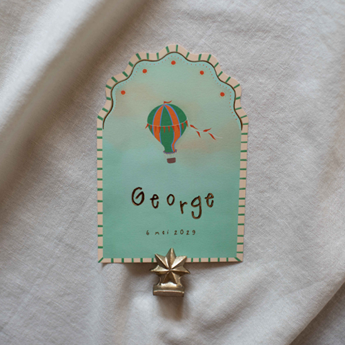 Een origineel geboortekaartje met colorblock kleuren en een prachtig wolkendek waar een vrolijke luchtballon in vliegt.