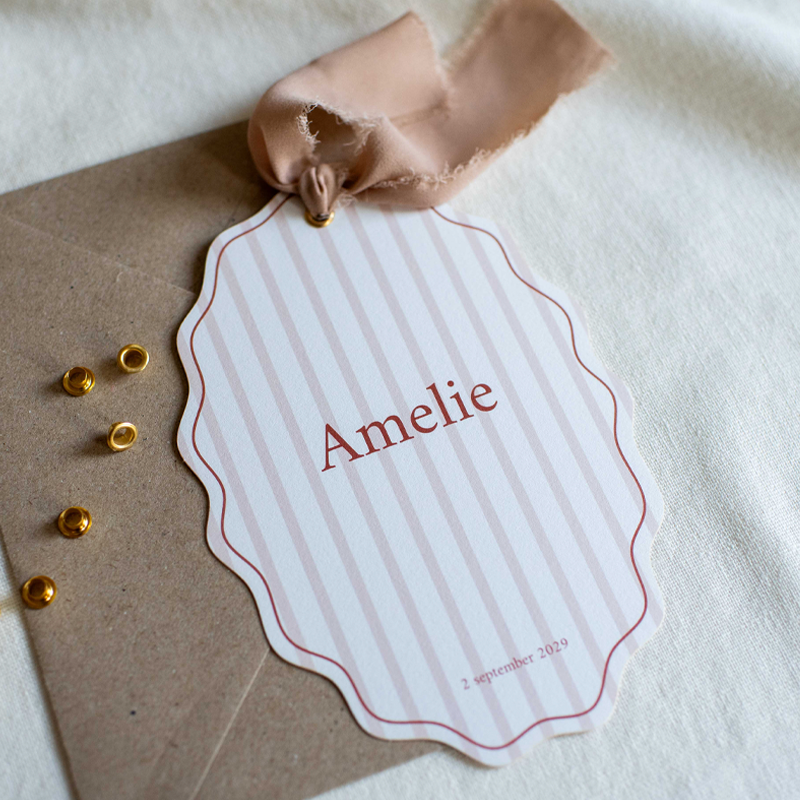 Klassiek geboortekaartje voor een meisje. Met roze gestreept patroon en unieke ovale kartelrand. Pas de kleuren eenvoudig aan in de online editor.