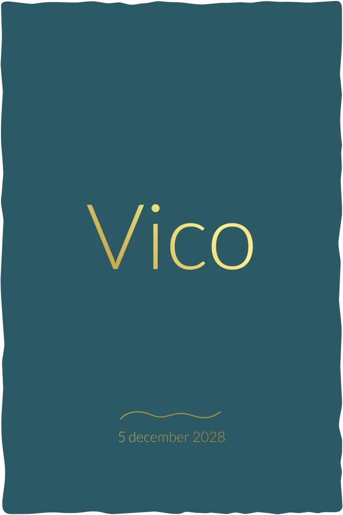 Klassiek geboortekaartje met geschept randje en een jeans blauwe achtergrond. De tekst op de voorzijde staat in goudfolie.