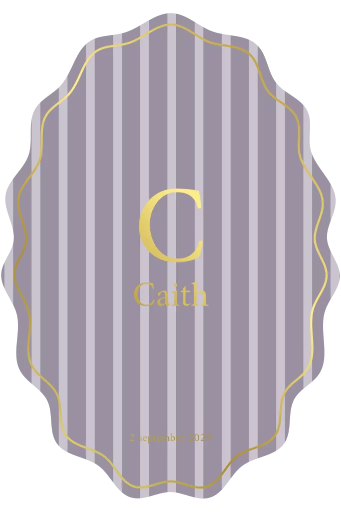 Kleurrijk geboortekaartje voor een meisje. Met paars / lila gestreept patroon en unieke ovale kartelrand. Pas de kleuren eenvoudig aan in de online editor.