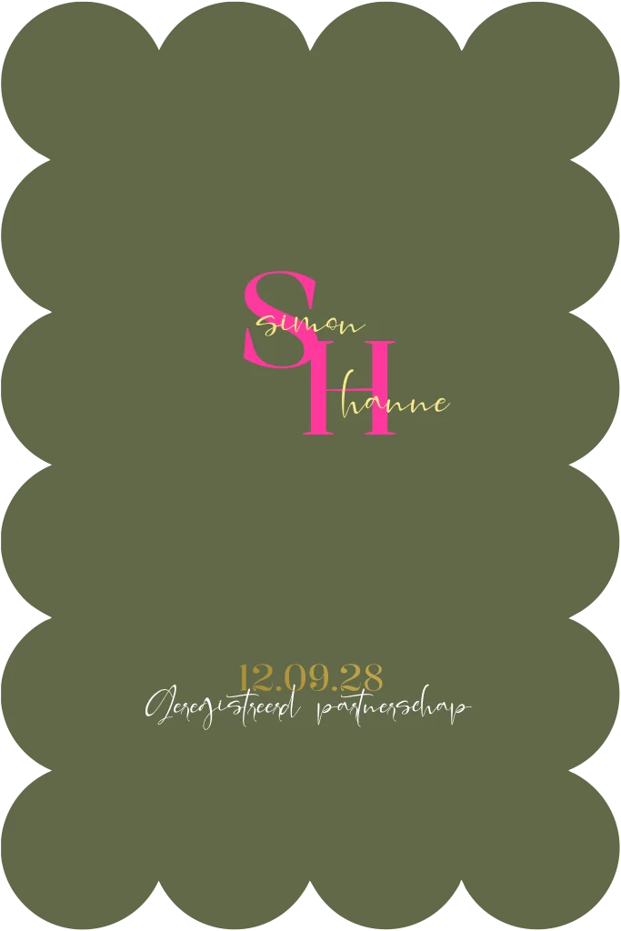 Kaart voor geregistreerd partnerschap met een combinatie van de vrolijke kleuren olijfgroen en fluor roze. De kleuren zijn eenvoudig aan te passen in de online editor zodat ze passen bij jullie eigen stijl.
