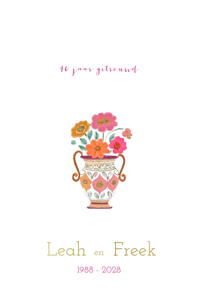 Uitnodiging voor het huwelijksjubileum in de unieke vorm van een poort. Met een vrolijke illustratie van een bloemenvaas. De namen op de voorzijde staan in goudfolie. Pas de kaart gemakkelijk aan in de online editor. Perfect voor een jubileum van 12,5 jaar of 40 jaar getrouwd.