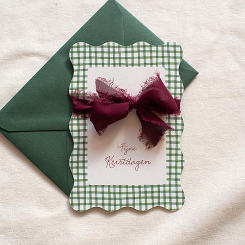 Originele kerstkaart met groene ruitjes en een echte strik. Let op: dit lint zit er niet bij, maar is een voorbeeld! Bewerk en bestel je kerstkaarten zelf online.