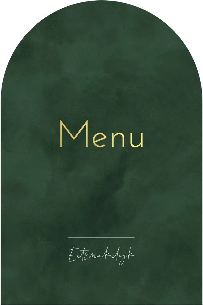Menukaart in de unieke vorm van een poort. Een minimalistisch ontwerp met donkergroene achtergrond. Het woord menu staat in goudfolie. Een menukaart die extra passend is bij groene thema's of bij een winterbruiloft.