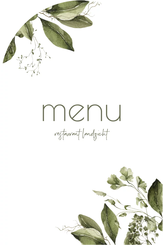 Menukaart in de unieke vorm van een poort. Een romantisch ontwerp met groene bladeren en takjes.