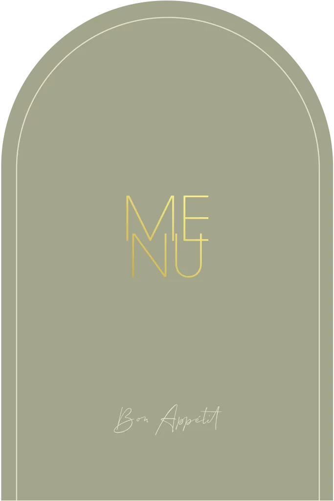 Menukaart in de unieke vorm van een poort. Een minimalistisch ontwerp met zacht groene achtergrond. Het woord menu staat in goudfolie.