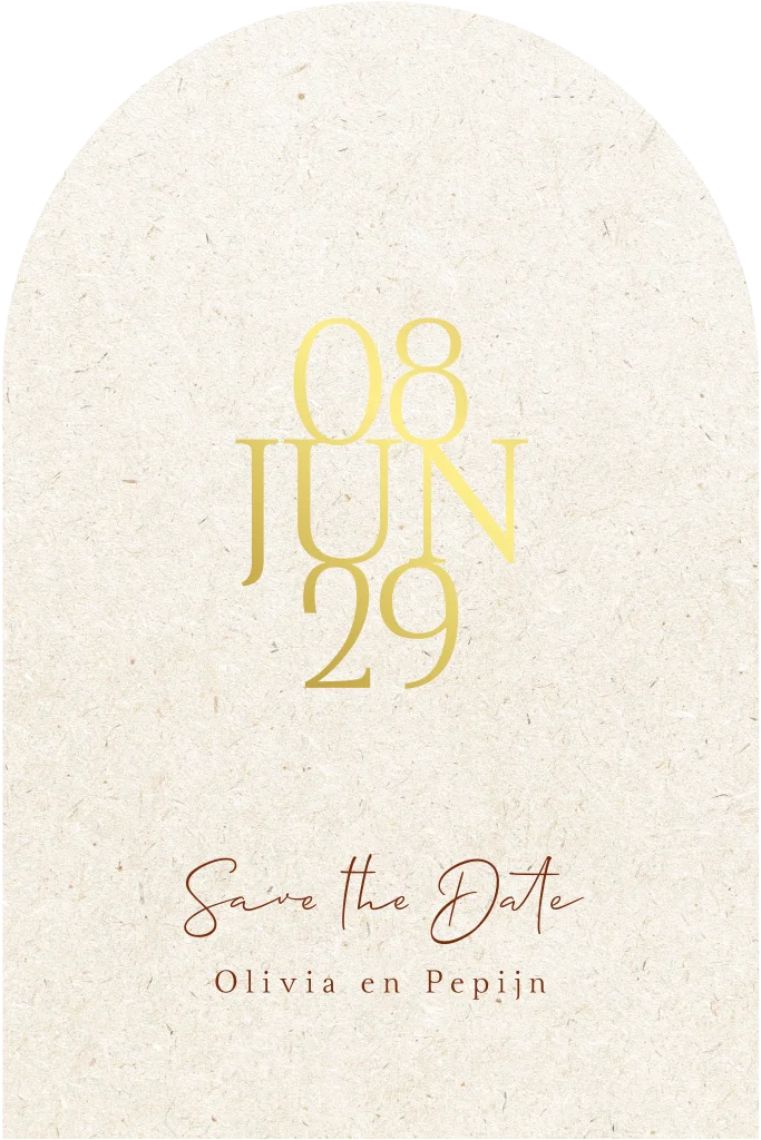 Save the Date in de unieke vorm van een poort. Deze minimalistische kaart heeft een modern en strak ontwerp met goudfolie datum op de voorzijde en een eco look achtergrond.