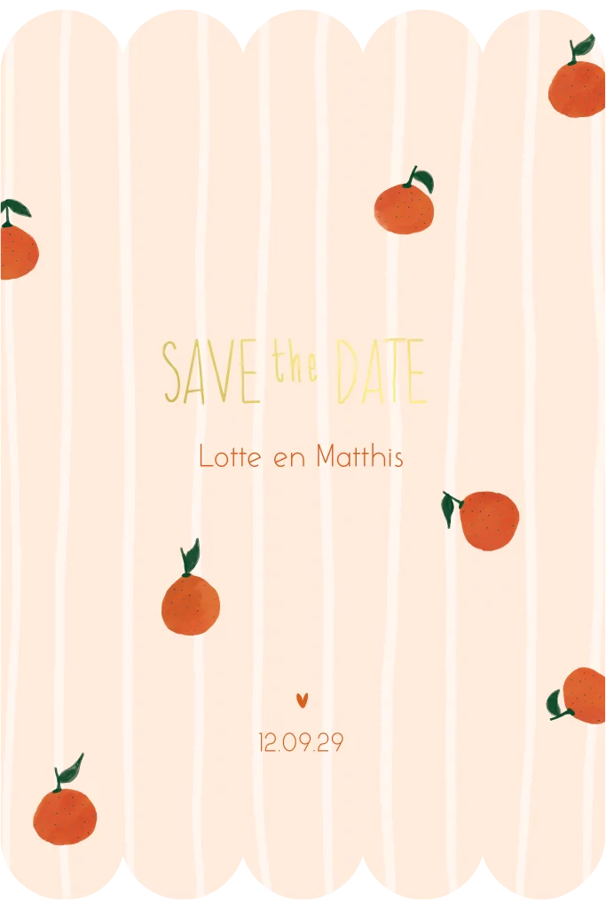 Een vrolijke Save the Date kaart met golvende randen, sinaasappels, streepjes en vrolijke zalmroze en oranje kleuren en lettertypes.