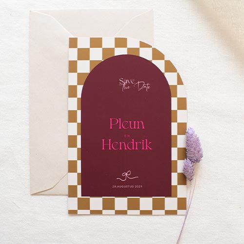 Hippe Save the Date kaart met een kleurrijk ontwerp. Een blokjes achtergrond in okergeel en beige tinten op de voorzijde. De achterzijde in oudroze met burgundy red. Op de voorzijde is een felroze kleur toegevoegd als afstekende kleur.