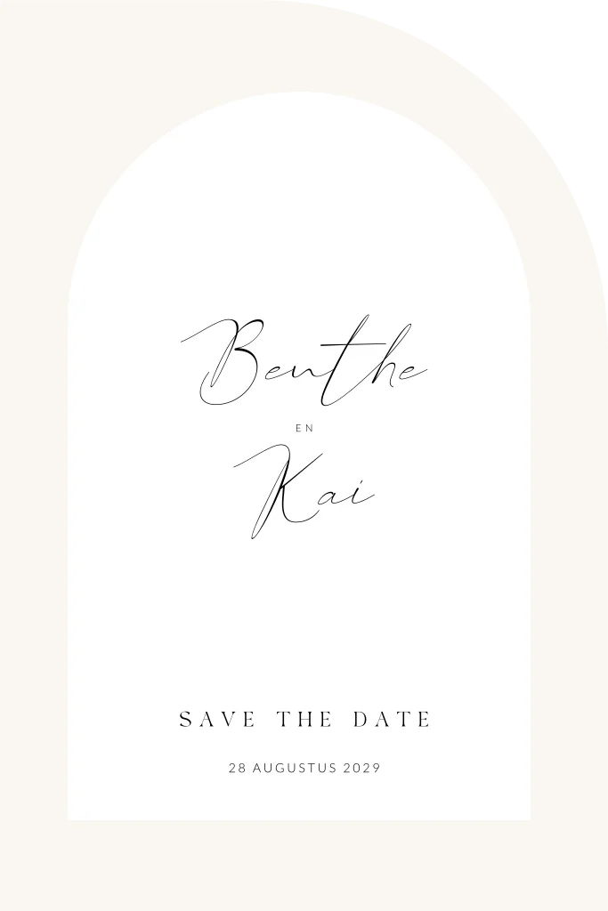 Een originele Save the Date met een unieke vorm. Een minimalistisch design met witte en beige kleuren.