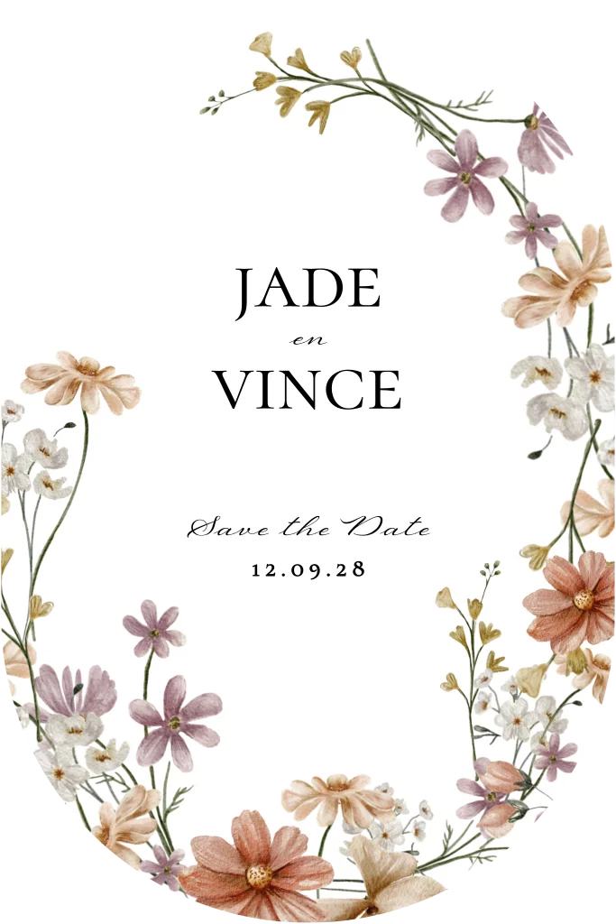 Save the Date kaart in een unieke, ovale vorm. Met een kleurrijke krans van bloemen.