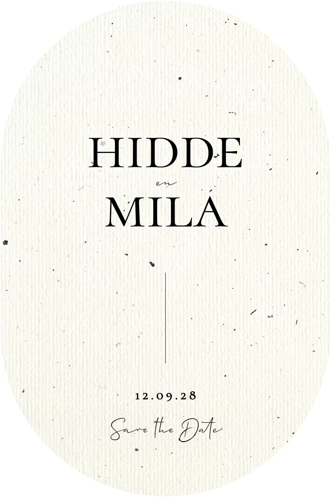 Save the Date kaart in een unieke, ovale vorm. Met zwarte vlekjes op de achtergrond.