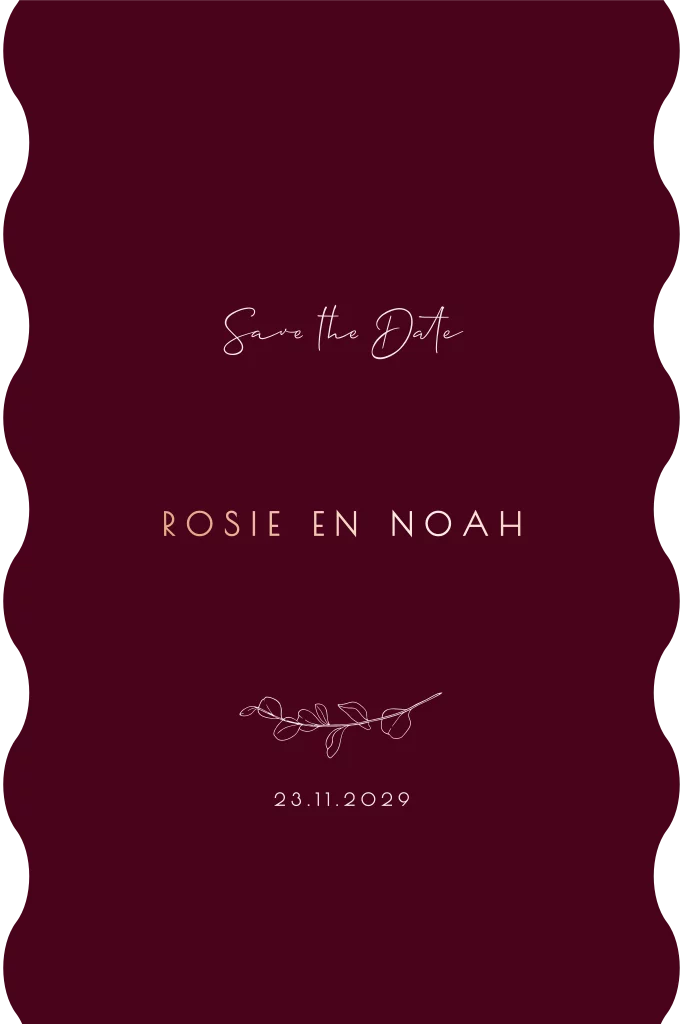 Save the Date in een unieke vorm met een golvende zijkant. De kaart heeft warme kleuren: beige en aubergine paars. De voorzijde van de kaart heeft letters in roségoud foliedruk. Op de kaart staan eucalyptus takjes in lijntekening. De perfecte combinatie voor een echte winter bruiloft.