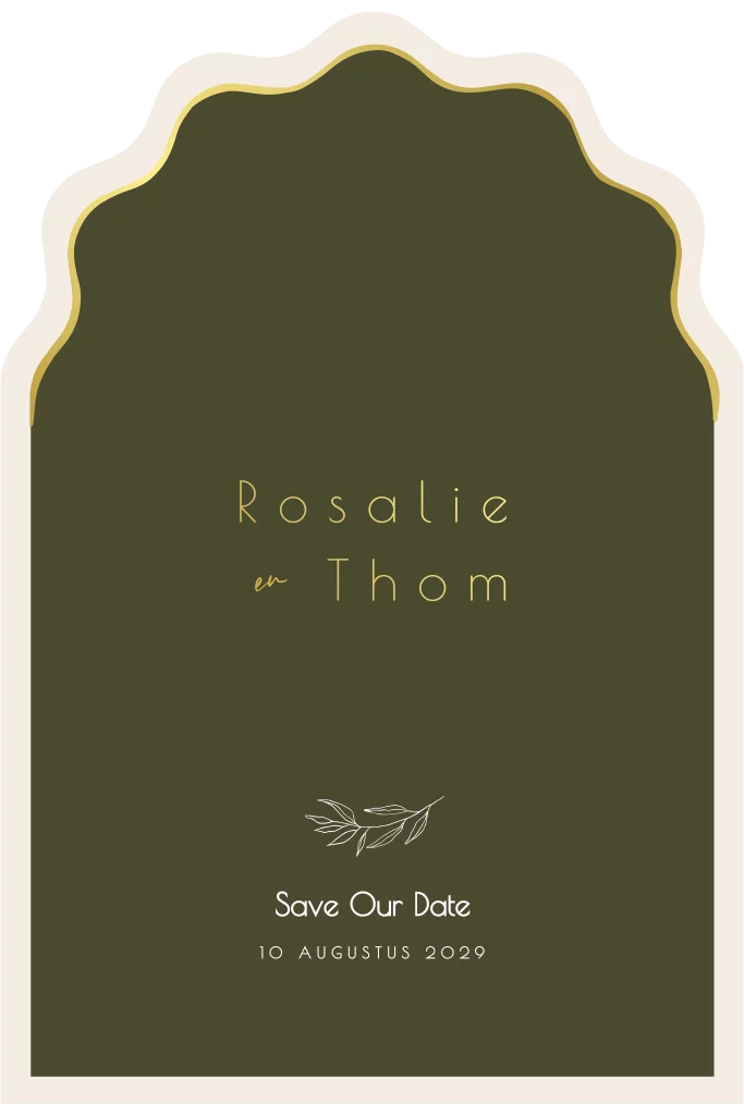 Een kleurrijke Save the Date met mediterraanse kleuren olijfgroen en brons. Op de voorzijde staat de tekst in goudfolie. Pas de kleuren van de kaart eenvoudig aan in de online editor!