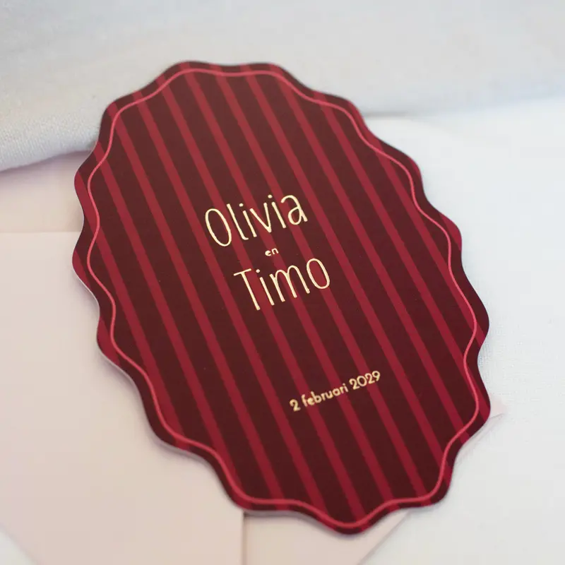 Stijlvolle en kleurrijke trouwkaart. Met paars/ bruin en fluor roze gestreept patroon en unieke ovale kartelrand. In combinatie met goudfolie elementen. Pas de kleuren eenvoudig aan in de online editor.