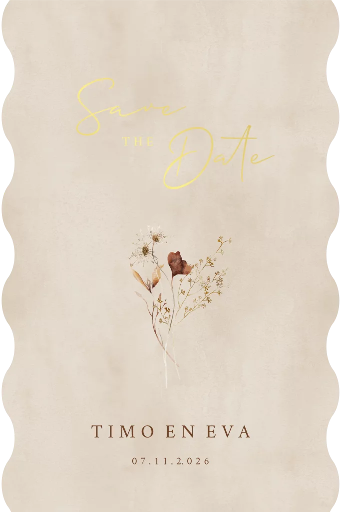 Save the Date in een unieke vorm met een golvende zijkant. De voorzijde van de kaart heeft letters in foliedruk. Bekijk de bijpassende trouwkaart in de Trouwkaarten collectie.