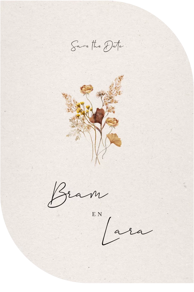 Een unieke Save the Date kaart met boven en onder een halfronde vorm. Een prachtige trouwkaart met aarde- en natuurtinten!