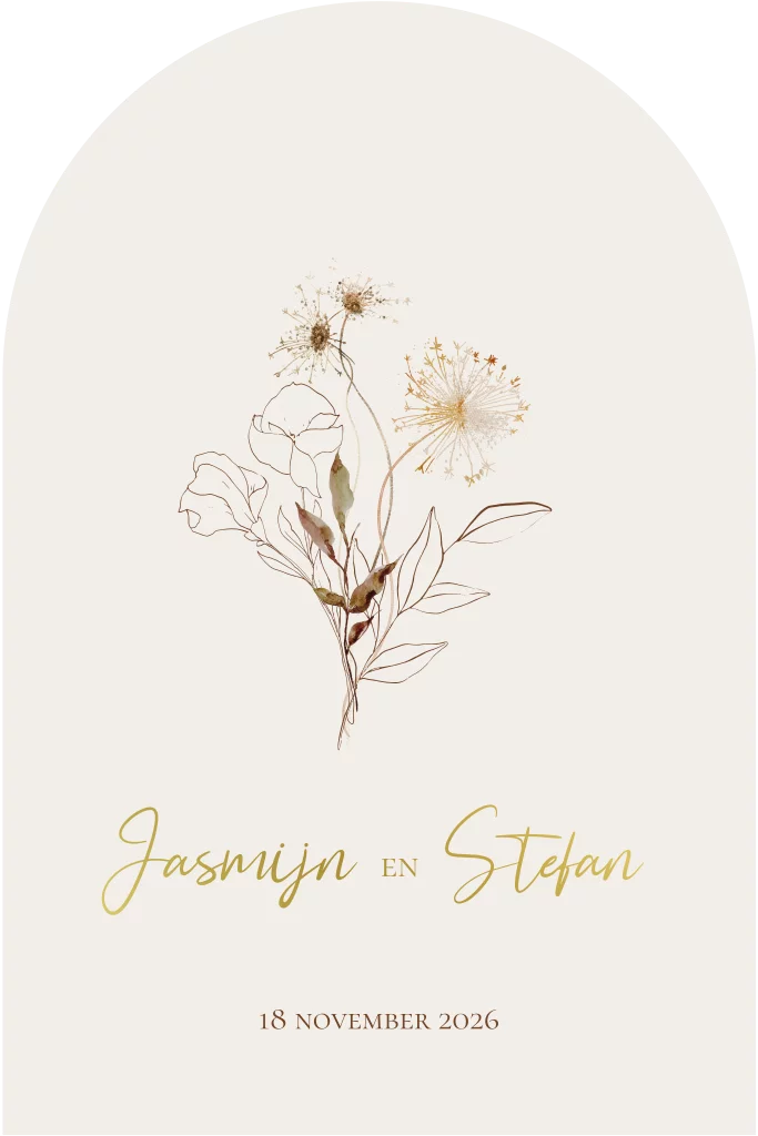 Trouwkaart in de unieke vorm van een poort. Een minimalistisch ontwerp met een mix van prachtige bloemen en bladeren. De voorzijde is voorzien van goudfolie tekst.