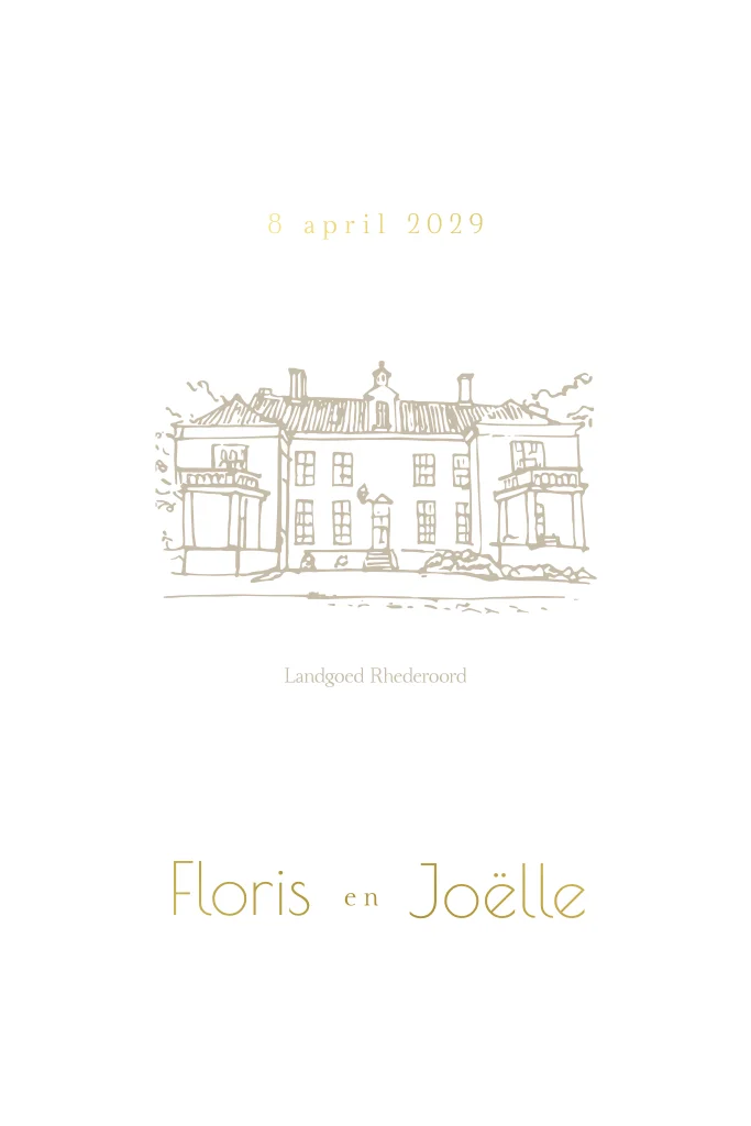 Trouwkaart in de unieke vorm van een poort. Met een unieke illustratie van de locatie. Op deze kaart staat Landgoed Rhederoord. Heb jij een andere locatie voor jullie bruiloft? Mail ons voor de mogelijkheden!