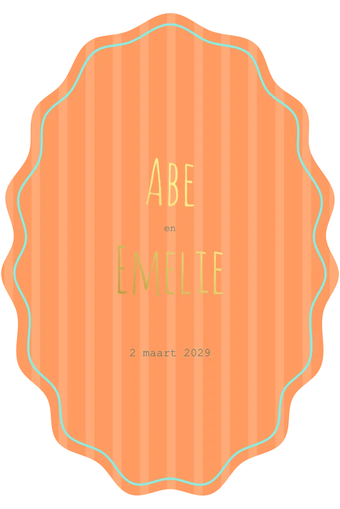 Kleurrijke trouwkaart in Ibiza kleuren. Met oranje en aquablauwe kleuren, gestreept patroon en unieke ovale kartelrand. In combinatie met goudfolie elementen.