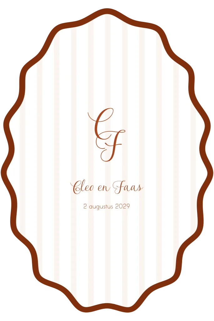 Deze trouwkaart heeft een unieke, organische vorm met een sierlijke rand en een rustige gestreepte achtergrond. Het ontwerp is stijlvol en tijdloos, met ruimte voor initialen, namen en de trouwdatum op de voorkant.
