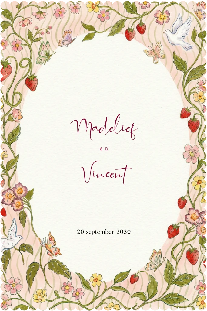 Een romantische trouwkaart met zomerse bloemen in pastelkleuren. Pas de kaart naar wens aan in onze editor.