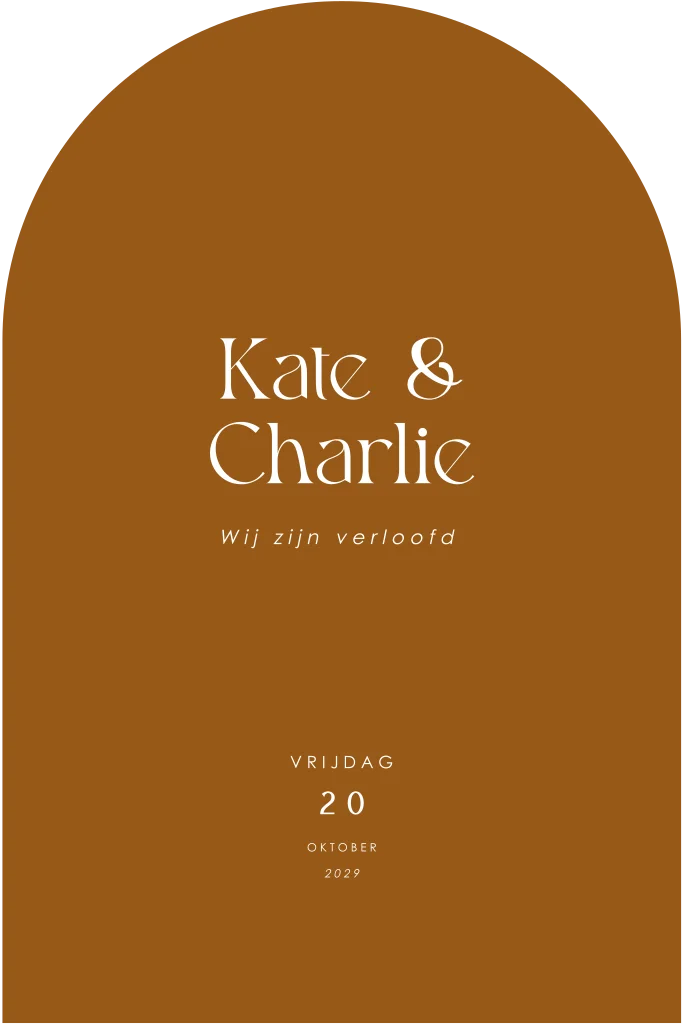 Deze verlovingskaart heeft een warme, rustige uitstraling en is vormgegeven in een warme terracotta tint met zachte, afgeronde boogvorm. De stijlvolle typografie en het heldere kleurcontrast zorgen voor een tijdloos en verzorgd geheel.
