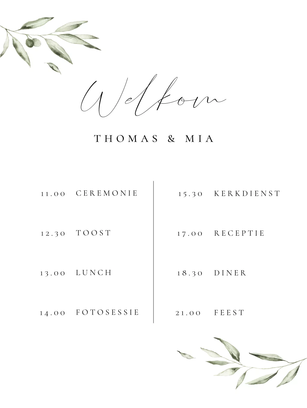 Bord voor de bruiloft met daarop het dagprogramma. In Mediterrane stijl met groene olijftakken.