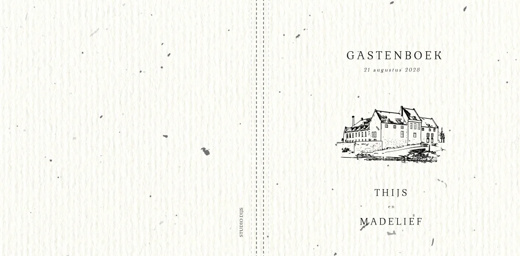 Gastenboek voor de bruiloft gebaseerd op de bijhorende trouwkaart. Dit gastenboek heeft een lijntekening van trouwlocatie Kasteel Woerden. Bekijk bij de afbeeldingen nog meer lijntekeningen van locaties. Staat jullie locatie er niet tussen? Mail ons dan voor een ontwerp op maat!“Wij zijn heel tevreden met de service van Studio Dijs. We waren op zoek naar een iets bijzonderder kaartje, en bij Studio Dijs vonden we precies wat we zochten. Zowel de proefdruk als de daadwerkelijke geboortekaartjes waren snel geleverd.”