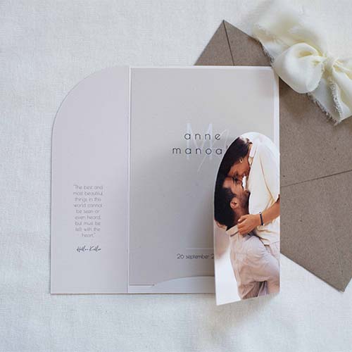 Insteek mapje voor de trouwkaart in neutrale kleuren; wit, zand en bruin. Met op de voorzijde een trouwlogo en een foto die je eenvoudig aanpast voor een eigen foto. Ontwerp zelf dit mapje met tekst en info naar eigen wens in de online ontwerptool. Kies de bijpassende trouwkaart om in dit mapje te steken. Let op: kies bij deze set envelopmaat 13,5 x 20 cm wanneer je de enveloppen los van het bestelproces bestelt.
