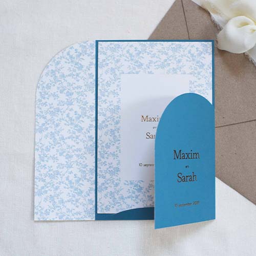 Insteek mapje voor de trouwkaart in romantisch blauw bloemenpatroon. De voorzijde is voorzien van goudfolie. Ontwerp zelf dit mapje met tekst en info naar eigen wens in de online ontwerptool. Kies de bijpassende trouwkaart om in dit mapje te steken. Let op: kies bij deze set envelopmaat 13,5 x 20 cm wanneer je de enveloppen los van het bestelproces bestelt.