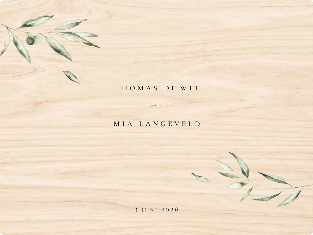 Houten bewaardoos in stijl van de trouwkaart. Met groene olijftakjes in watercolor stijl. Leuk als huwelijkscadeau of om jezelf cadeau te doen na afloop van de bruiloft!