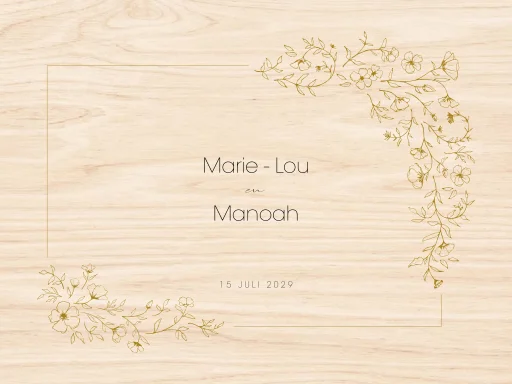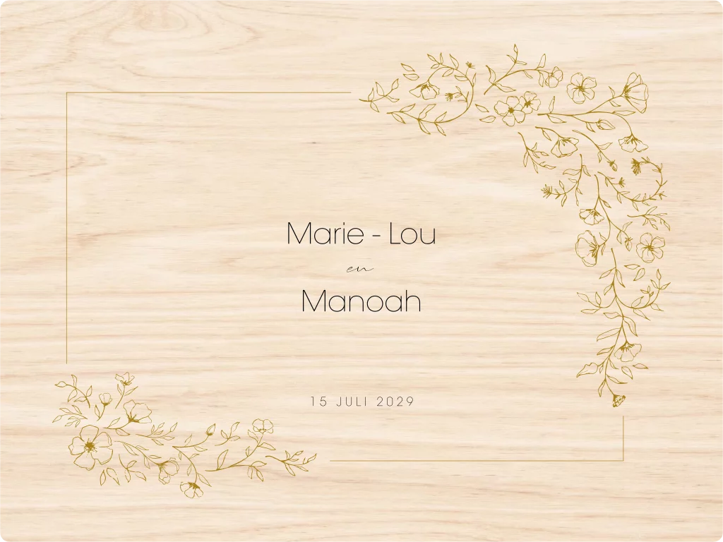 Houten bewaardoos in stijl van de trouwkaart. Met sierlijke bloemen in lijntekening. Leuk als huwelijkscadeau of om jezelf cadeau te doen na afloop van de bruiloft!