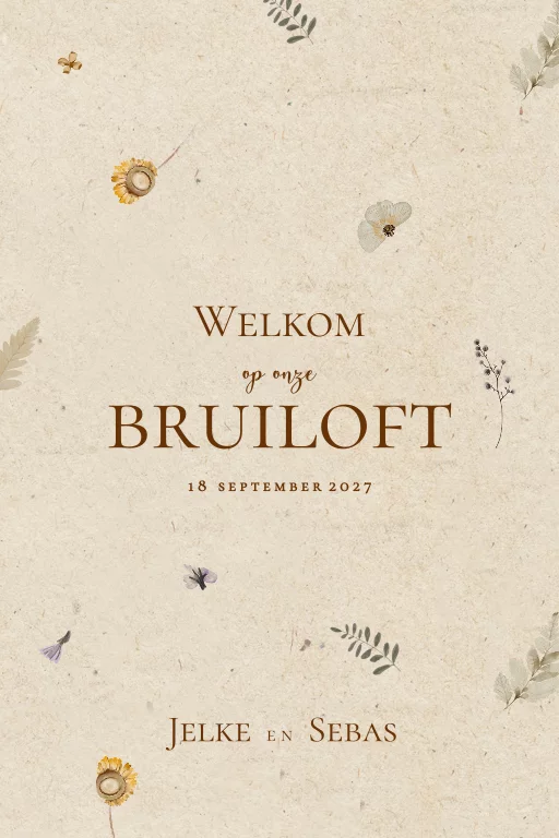 Romantisch welkomstbord voor de bruiloft. Met een eco look achtergrond en vrolijke droogbloemen en takjes. Dit bord wordt gedrukt op het materiaal forex van 5 mm dik. Dit is een stevig, weerbestendig materiaal dat geschikt is voor op bijvoorbeeld een schildersezel.