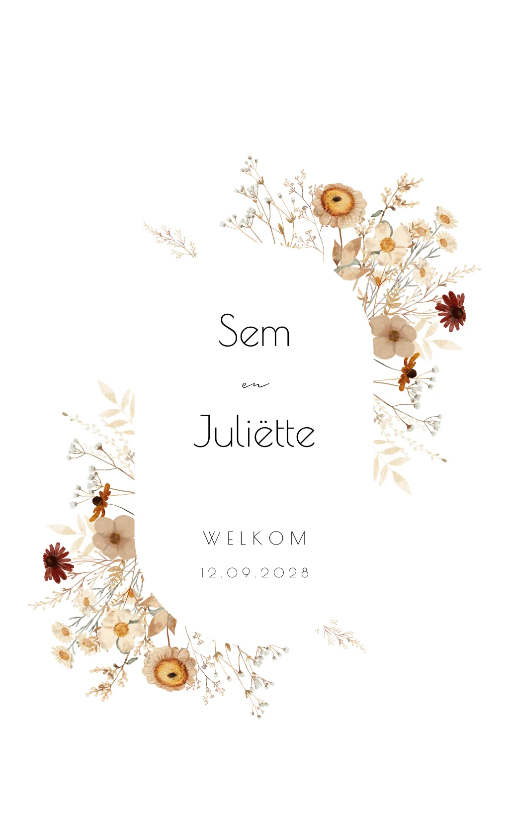 Welkomstbord bruiloft romantische bloemenkrans aardetinten