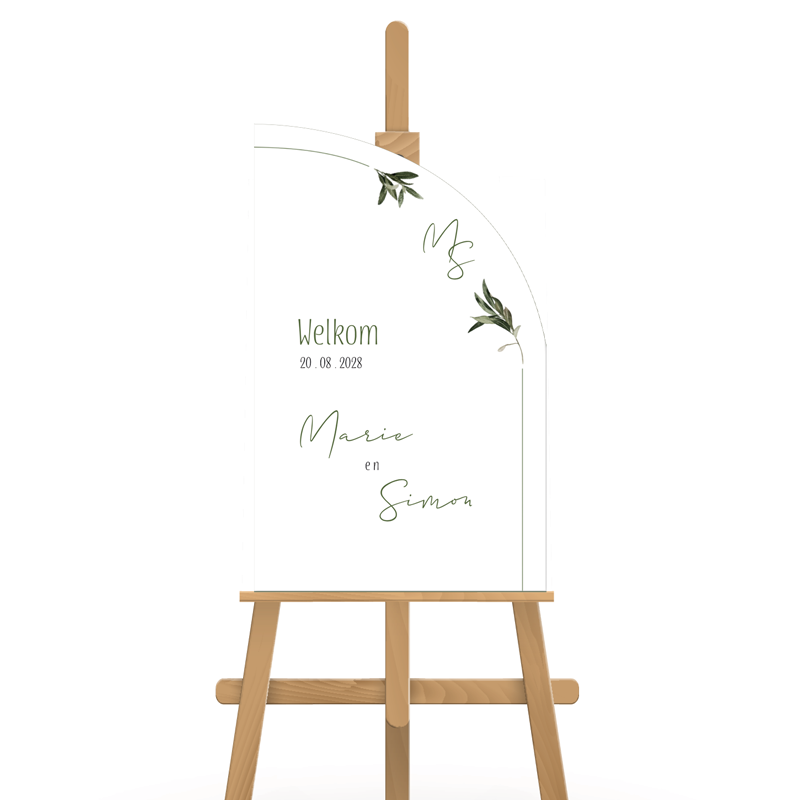 Welkomstbord voor op de bruiloft. Met een unieke halve boog en olijftakjes aan de uiteindes. Dit bord wordt gedrukt op het materiaal forex van 5 mm dik. Dit is een stevig, weerbestendig materiaal dat geschikt is voor op bijvoorbeeld een schildersezel.