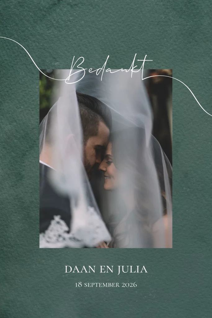 Bedankkaart met foto, aquarel groene achtergrond en goudfolie letters op de voorzijde.