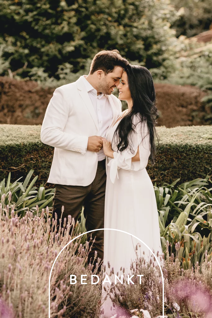 Een romantische bedankkaart met foto en een boog in goudfolie. Op de achterzijde staat een fleurige bloem, wat het totaalplaatje compleet maakt!