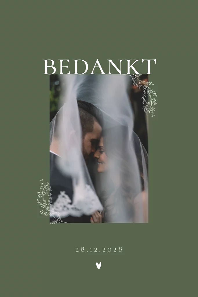 Bedankt kaart met groene achtergrond. De voorzijde is voorzien van de warme kleur goudfolie. We adviseren linnen papier bij dit kaartje.